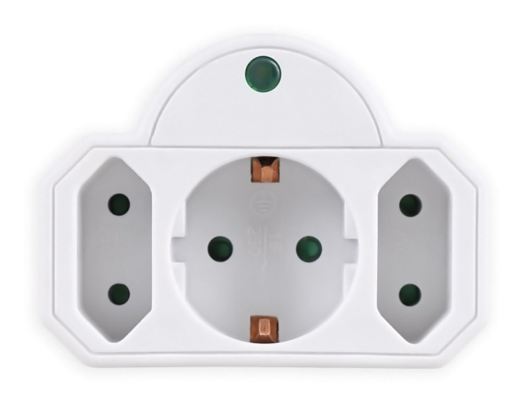 Αντάπτορας ρεύματος Powertech 3 θέσεων, 1x schuko και 2 διπολικών, με μηχανισμό ασφαλείας για παιδιά και προστασία υπέρτασης.
